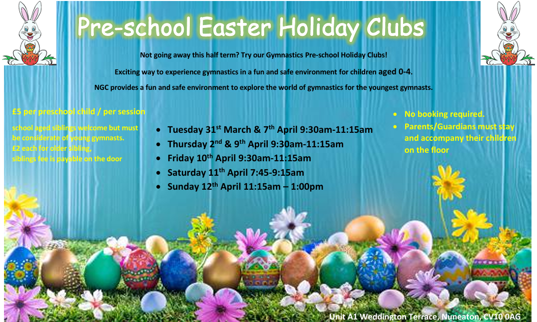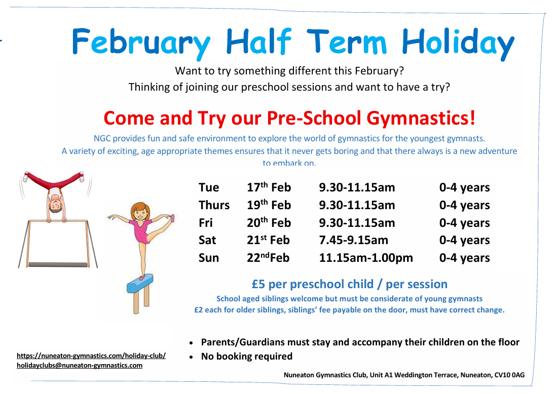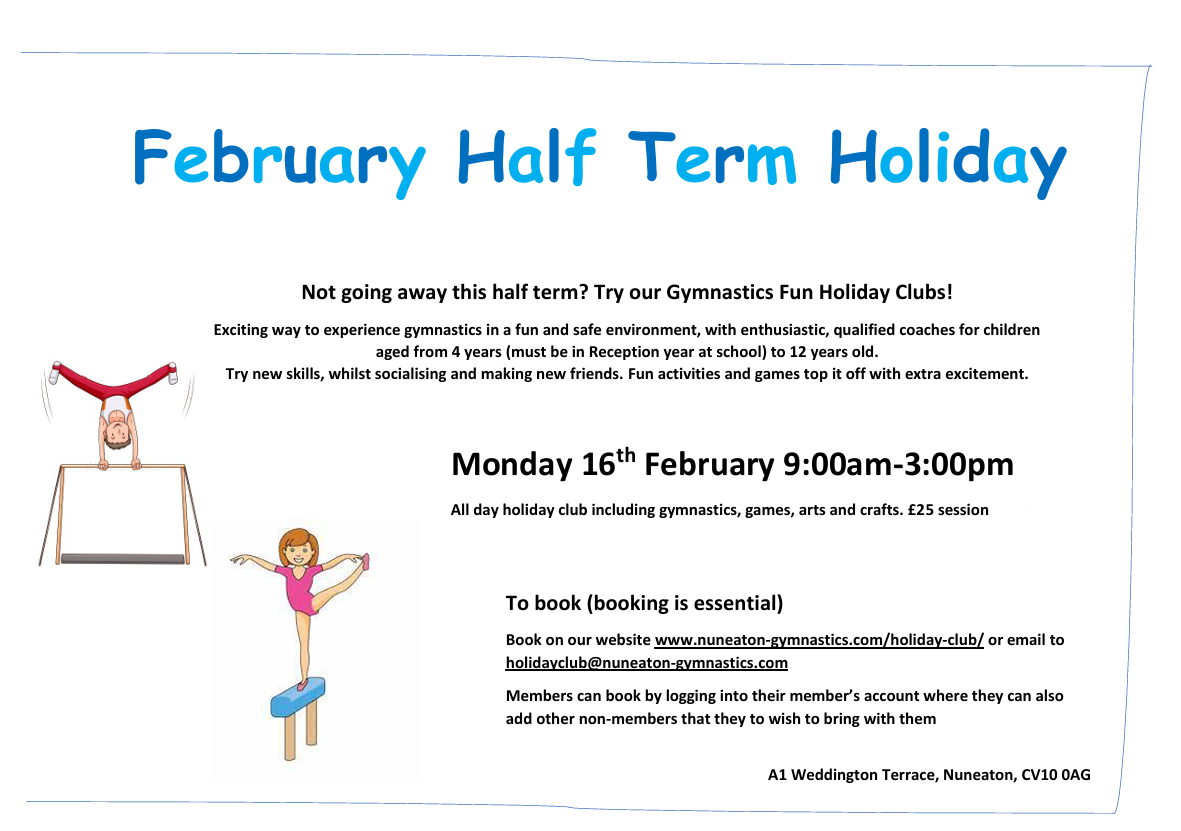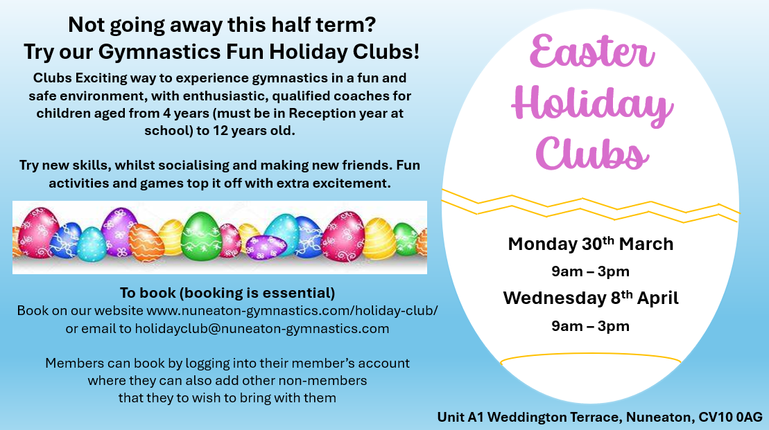 If you have any questions, please don’t hesitate to contact us on holidayclub@nuneaton-gymnastics.com